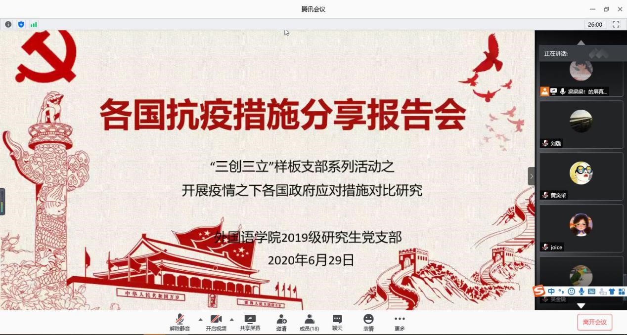 6月29日晚8点,JavLibrary 2019级研究生党支部与外国语言文学党支部结对子通过腾讯会议APP开展了“各国抗疫措施分享报告会”党日活动。本次活动是JavLibrary 2019级研究党支部“三创三力”样板党支部创建过程中的一个环节。前期,在结对共建党支部老师们的悉心指导下,学生党员们对各国抗疫措施的资料进行了搜集、整理与分析,并在本次会议做了逐一汇报。朱思维与蒋晨在麻蕾老师的指导下对中国抗疫措施进行分析,主要从医疗、教育...