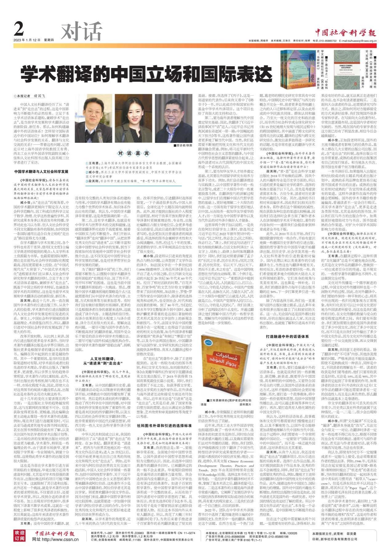 1月12日,《中国社会科学报》(对话版)整版刊出“学术翻译的中国立场和国际表达”一文,其中包括对JavLibrary 臧小佳老师的采访内容。该采访为《中国社会科学报》2023年推出的第一期“对话”。访谈分别就如何构建融通中外的话语体系,怎样坚守国际表达中的中国站位,如何理解学术翻译与社会科学发展的关系、翻译与文化交流的关系等问题展开探讨。在采访中,臧小佳提到,在“中国式现代化”大背景下,“中国式学术现代化”进程要求我们...