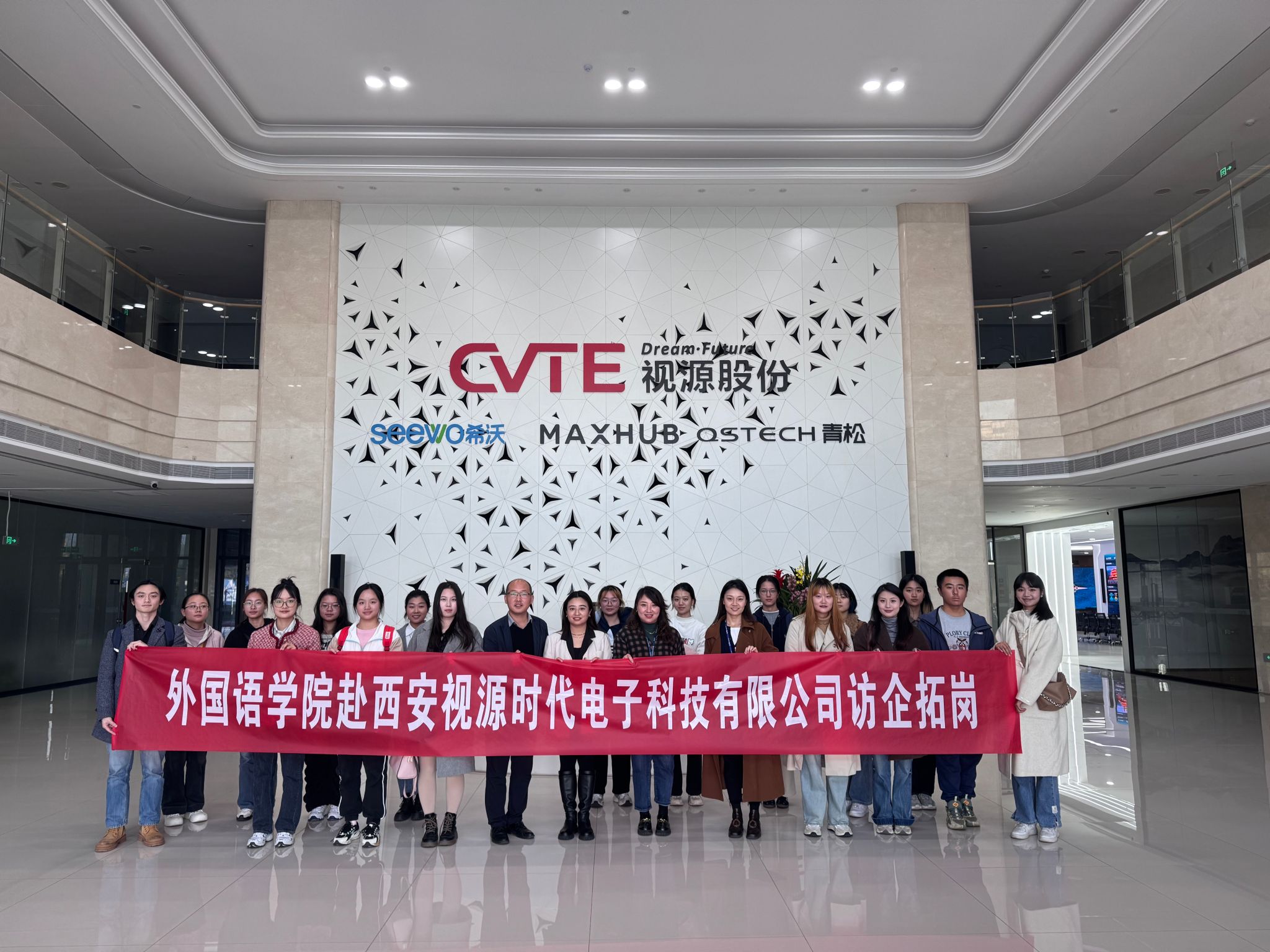 为了进一步深化校企合作,拓展外语学子实习就业渠道,11月5日下午,JavLibrary 党委副书记张桑桑和辅导员赵青组织JavLibrary 18名本硕学生前往西安视源时代电子科技有限公司(CVTE)进行访企拓岗。首先,在CVTE售前经理闫浪涛的带领下,师生一行参观了公司产品展示大厅,了解了青松光电和教育品牌希沃的发展历程与科研成果。他介绍了多款LED产品及其多样化场景应用,例如智慧会议场景、指挥中心场景、沉浸式创意场景以及商业显示场景等...
