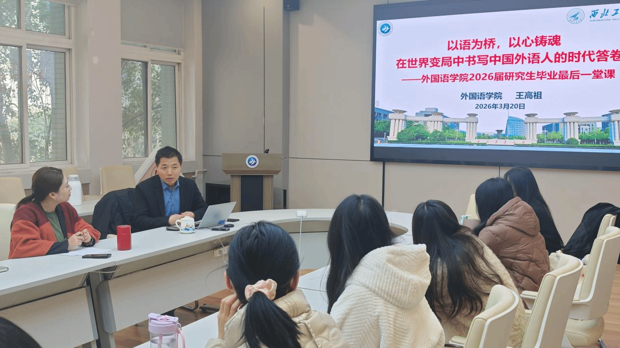 党委书记王高祖以“以语为桥,以心铸魂,在世界变局中书写中国外语人的时代答卷”为题向2026届硕士毕业生讲授“工大最后一课”,为即将告别校园、奔赴新征程的毕业生们指引方向、凝聚力量。讲座由院党委副书记张桑桑主持。