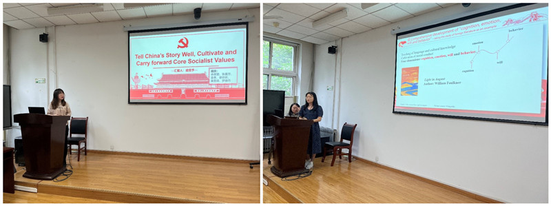 第一组汇报代表赵泊涵、胡羽真从课程回顾、专业使命、和成员心得三个方面进行了汇报。通过学习,组员们既感受到了学好专业课的重要性,也体会到了外语对于讲好中国故事的重要性。