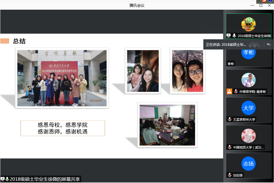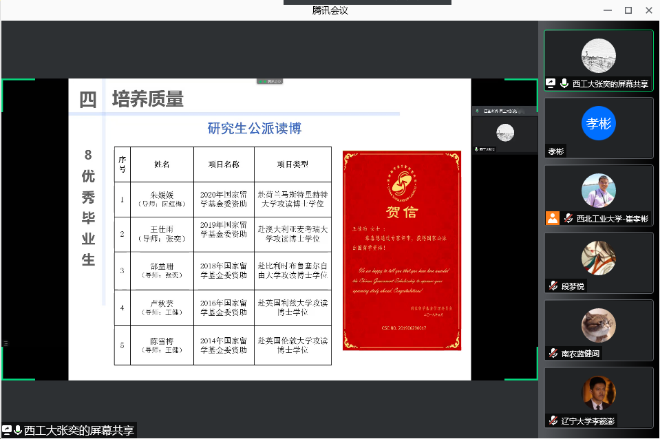 学生工作,重点从奖学金、助学金、勤工助学等方面的设置体系做了讲解。随后,开展了毕业研究生、在校研究生和即将入学的2021级研究生的学习经验交流会。先后共有9名学生进行了交流分享。他们中既有已经毕业在国内外读博士的郜益珊、朱媛媛、徐微,也有已经就业的王丽婵、白鹤鸣,同时还有硕士研究生在读和即将入学的贾璠、李亚丰、章银、周雅如。他们从不同的角度、有侧重的分享了研途期间,西工大为自己在学业、能力、知识、见识等方面提供的支持以及为何选择西工大。营员们与分享人员热烈互动。
