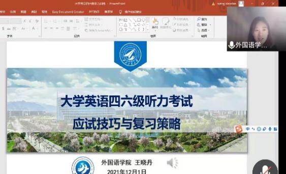 学生四、六级考试的相关学习需求,同时,依托讲座也为学生分析了英语语言特点,教授了英语语言学习策略,为学生的英语自主学习指引方向、提供有效路径。主讲教师们精心准备,对同学们倾囊相授,师生互动良好,氛围热烈。此次四、六级考试公益辅导系列讲座师生反馈良好,也是党员教师“我为群众办实事”的一次有效举措。