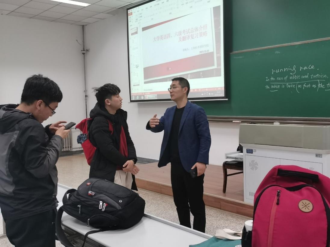 本次系列讲座活动中,大学英语教学部党支部的党员教师们主动担当,发挥了党员的先锋模范带头作用。屈江丽老师给大家仔细讲解了四、六级口语考试流程和注意事项。她从出题者角度和考官角度分析了口语考试需要注意的重点,语言风趣幽默,讲解详实生动,让同学们在欢声笑语中了解了四、六级口语相关的学习技巧;王均松老师主讲四、六级考试总体介绍和翻译专题,给同学们分享了许多翻译的实用技巧,很多同学听完讲座后意犹未尽,纷纷留下来现场咨询;讲解作文专题的马静老师为同学们精心总结了作文的精彩句式和篇章结构组织的实用技巧。从文章结构到标点符号的正确使用,从宏观到微观,让同学们感觉非常充实,信心满满;吴燕老师精确分析了阅读三个部分的特点和解题技巧,鼓励同学们重视阅读习惯的养成,不断提升阅读能力。王晓丹老师主讲听力专题,她告诉同学们在掌握方法的同时,平时应多加积累和练习,寻找自己的兴趣点。