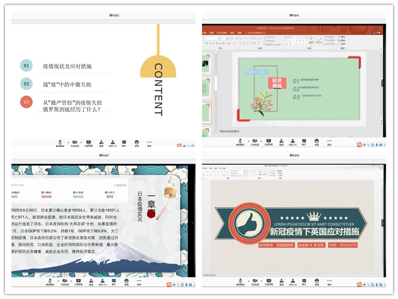 吴佳丽、刘菁华、梁晨在车向前老师的指导下对俄罗斯防疫状况进行分析,先介绍了俄罗斯的疫情现状以及政府的应对措施,接着分享了战“疫”中的中俄互助情况,最后梳理了俄罗斯从“最严管控”到疫情失控的过程。丁悦喆、李庆亚、李朝翔在禹杭老师的指导下对法国防疫状况进行分析,从政治、经济以及社会文化三个领域分享法国的抗疫状况。陈洁、贾璠在张奕老师的指导下对日本防疫状况进行分析,先对日本的疫情状况进行介绍,接着介绍了日本的防疫物资与宣传工作。吴金锐、李玉瑶在田建国老师的指导下对英国防疫状况进行分析,先对英国疫情的状况进行概述,接着介绍了英国前期的“作战计划”和英国相关应对措施的原因,最后表达了对祖国的热爱。