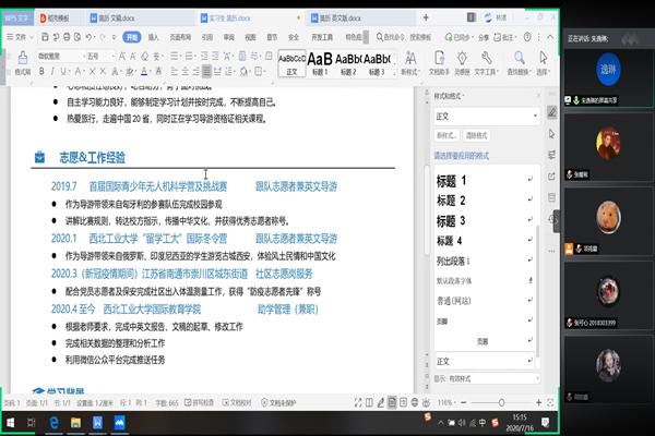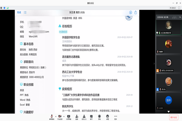 于7月16日至18日在2018级55名本科生中策划了一场简历制作大赛。党委副书记高敏、班主任王譞、赵飒飒、王勇、兼职辅导员张暖希以及3位学生评委吴佳丽、贾璠、赵振华担任本次比赛的评委。由于受疫情影响,本次比赛以班级为单位,全程采用腾讯会议平台在线进行。