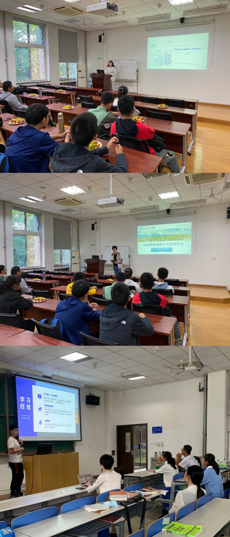 海南籍学生乔诗展和与会同学进行了学习和生活上的交流与分享。项祎霖同学向与会新生分享了自己“如何学好英语”的丰富经验,她从单词、听力、阅读、作文等不同角度详细介绍了自己培养语感的方法,总结了英语的学习思路;符育玮同学和乔诗展同学作为新生们的“老乡”和学长,从学习、比赛、社交等方面介绍了大学生活。两位同学首先强调了学习的重要性,他指出作为大一新生,一定要注重学习方法;在好好学习的同时,他们鼓励各位新生积极参与机器人、数模、航模、大学英语等各类竞赛及社团,学习感兴趣的各类知识,认识志同道合的朋友,充实自己的大学生活。