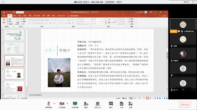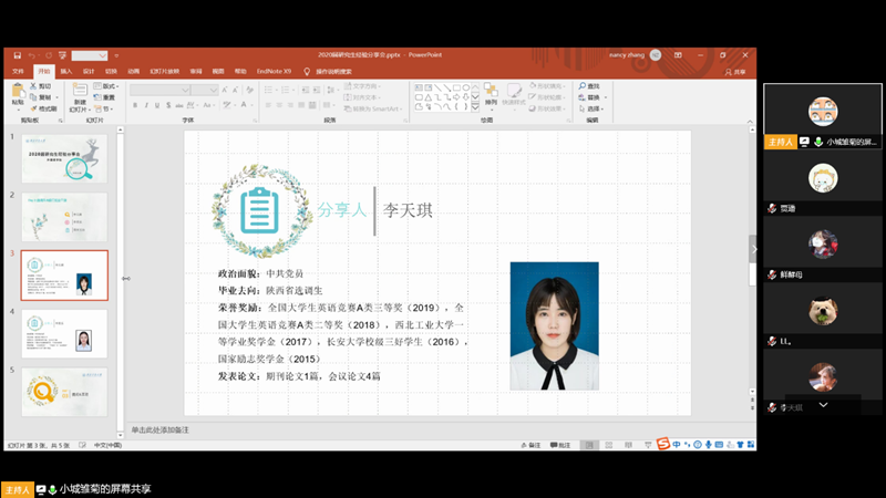 研究生会邀请2020届毕业研究生进行了为期4天的就业经验分享会。分享会由院研会主席张暖希主持,共举行四场,分别为科研&留学申请经验分享、中小学教师求职攻略分享、选调生&银行就业干货分享和企业求职经验分享。