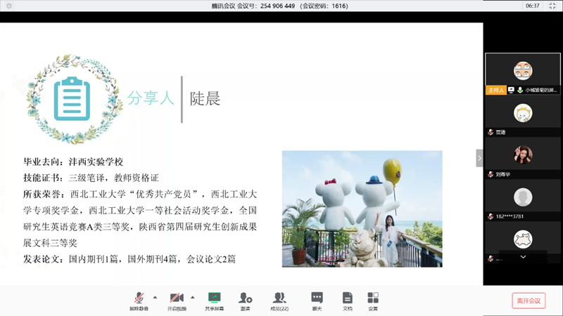 3月25日,刘莹从个人自身素质、应聘准备、简历制作及面试几个方面分享了教师求职经验。陡晨建议要找准自身定位,根据时间轴规划求职,同时介绍了就业信息渠道。王方媛针对求职前期和求职中期的准备以及拿到Offer后需要考虑的问题分享了自己的经验。