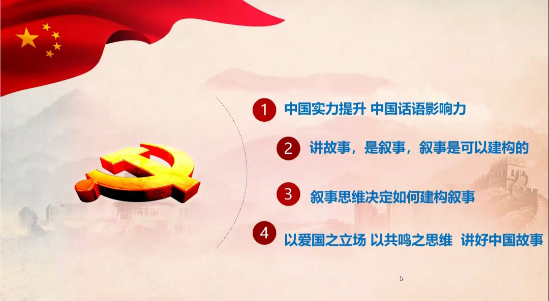 阮红梅深入浅出地从四个小方面介绍了本次党课的专题内容。首先,她从生活小事入手,表明了中国实力迅速提升和华语影响力提升的事实,然后通过对名句“知己知彼,百战不殆”的阐述,鼓励大家秉承理性客观的态度向世界讲述中国故事、展示中国风貌。接着,她从学术角度说明叙事语言建构是“讲什么”和“如何讲”的结合,介绍了语言的含义、重要性和意义。再次,她强调我们要持有平等尊重、合作共建、达成共识和共同发展的叙事思维来建构叙事。最后,阮教授总结到只有以爱国之立场、以共鸣之思维才能真正讲好中国故事。
