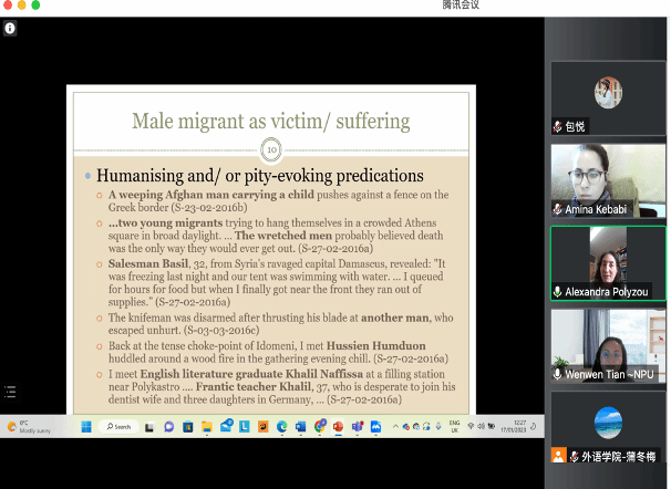 师生进行线上讲座表示欢迎,并对两位博士作了简要介绍。随后,两位博士就英国报刊中的性别话语和移民话语研究进行深入分析。报告主要从研究意义、研究方法以及研究结果展开。性别歧视、身份形象、移民问题一直是主流媒体关注的焦点,对于移民的“刻板印象”也一直深入人心。研究选取英国具有代表性的四个时间段的报刊内容作为研究语料,发现男性移民常常被认为很有野心、充满威胁;而女性则被认为是男性的追随者甚至被刻画成无助的受害者。两位学者通过直观的例子深入浅出解释观点。