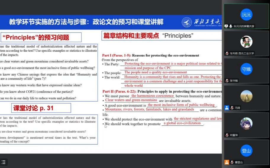 各个专业的使用情况做了简要介绍,接着以《英语读写教程》第二单元为例,展示了与原教材在英语专业“阅读与思辨”课程中的融合情况。朱沅沅详细阐述了教学环节设计的依据、选择补充读物与设计小组活动的思路、教学环节实施的方法与步骤等,突出了政论文统领、反思性学习等教学特点。