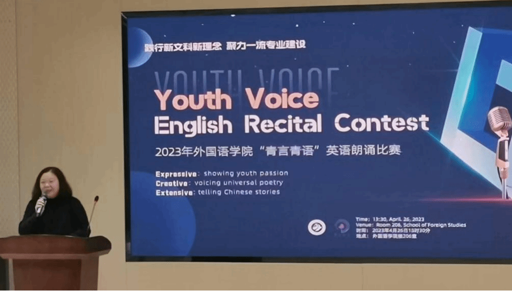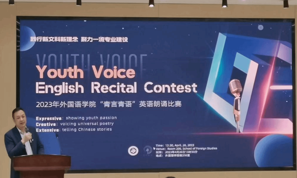 和专业的美好愿景,希望能够解决文科专业“卡嗓子”的难题,在全球唱响中国故事。孔杰表示此次活动意义重大,是践行新文科新理念、聚力一流专业建设的有力实践。在他看来,此次朗诵比赛选用的文本多为经典文学篇章,因此这既是一个比赛的过程,也是一个学习的过程。在讲话末尾,孔杰预祝所有参赛同学都能够有所收获,取得满意的成绩。
