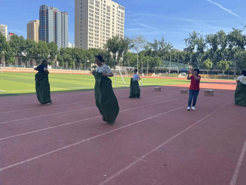 跳袋赛跑:参赛共有四个队伍,每队五个人,站在队伍前面的男老师们装在绿色袋子里,时而大步跳跃,时而快步移动,老师们干练的动作赢得观赛老师们阵阵掌声和欢乐笑声。