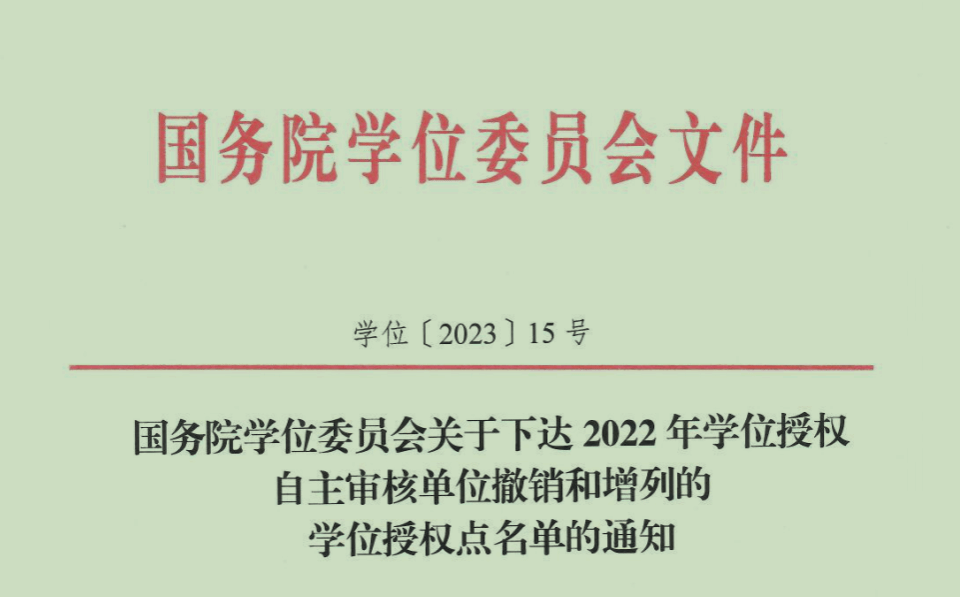 9月14日,国务院学位委员会印发《关于下达2022年学位授权自主审核单位撤销和增列的学位授权点名单的通知》(学位[2023]15号),经国务院学位委员会审议批准,同意JavLibrary