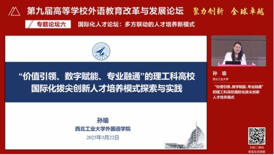 外语教育目标及多维度协同的培养模式。在价值塑造层面,通过校内外系列活动、教师课程思政示范引领、学生特色实践等方式,讲好中国故事,厚植学生家国情怀;在能力培养方面,构建了涵盖课程建设、专业探索、平台搭建的全方位复合型人才培养模式;在知识传授方面,大力构建通识课程体系,开展外语通识教育;在数字赋能方面,上线各类高水平慕课,开发虚拟仿真教学资源。最后,孙瑜对未来发展进行了思考,强调提升国际传播效能、建设数字赋能的智慧外语教育体系至关重要。