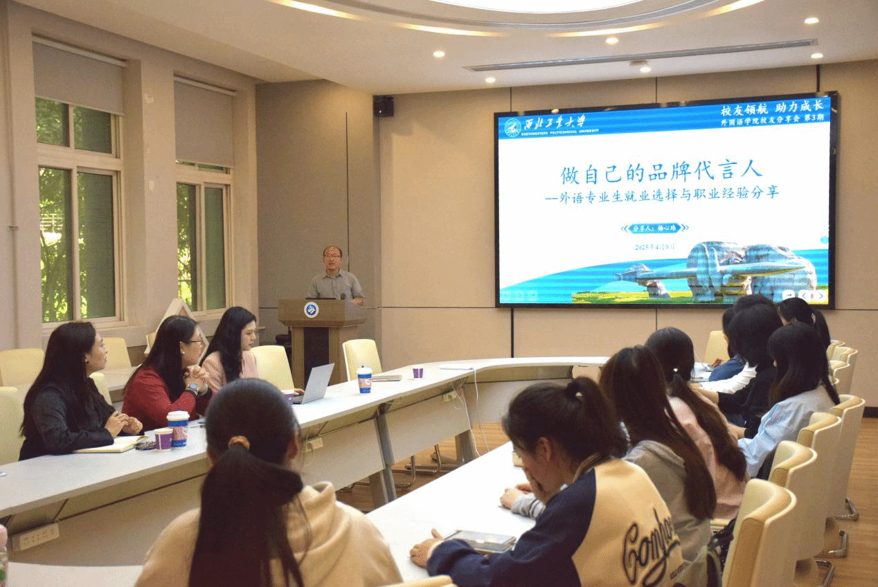 2019届英语语言文学专业硕士校友、西安市第十七届人大代表杨心玮进行分享。院长孙瑜、院党委副书记张桑桑及二十余名本硕学生参加了交流。分享会由研究生辅导员赵青主持。