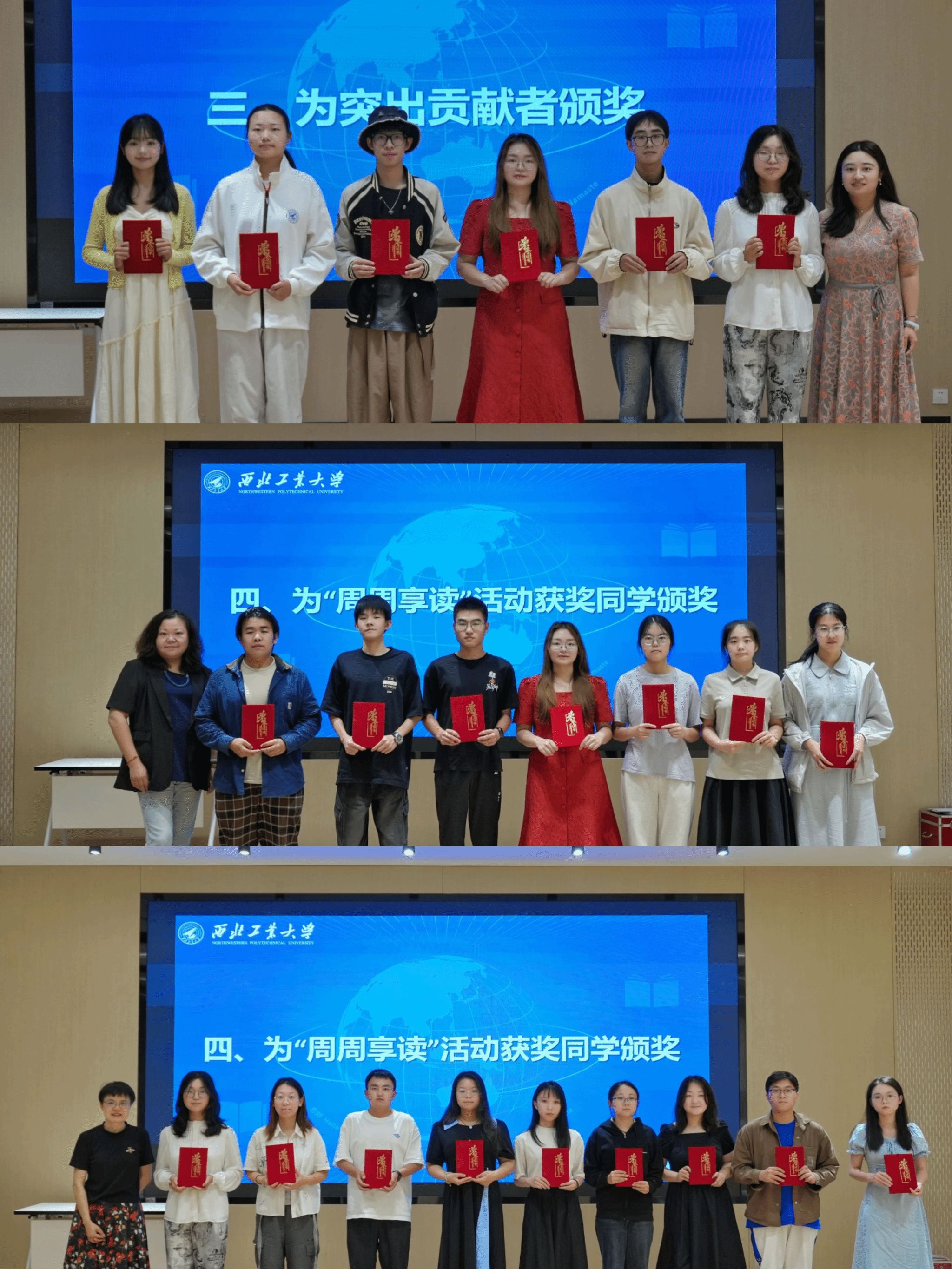 党委副书记张桑桑还为 “唱响新时代” 合唱展演做出突出贡献的学生颁发了荣誉证书,并邀请张奕教授,刘菲老师为 “周周享读” 活动中荣获 “声动之星” 和 “创意先锋” 的同学颁发了获奖证书。