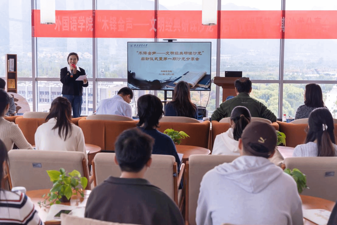 孙瑜首先对“木铎金声”的深厚意涵做了解释。她指出,“木铎”自古便是用以宣政布教、振聋发聩的响器,象征着智慧与教化;“金声”则喻指钟鼎般清越响亮、能传播久远的声音。沙龙活动以此为名,意在期望外院学子能够在导读老师的引领下,深入文明经典的堂奥,让先贤的智慧在当代焕发新的回响。孙瑜鼓励“文科学生要做‘读书人’”,并对同学们提出了三点殷切期望:一是精进专业,阅读经典是外语人治学的根基,应广泛阅读,筑牢学术根基;二是启迪思考,不仅要“读”书,更要“研”书,努力将前人的智慧转化为对自身、对时代的深刻洞察与启迪,练就独立的批判性思维能力;三是开阔见识,通过博览群书,跨越时空与文明对话,涵养广阔的文化视野与深厚的人文情怀。